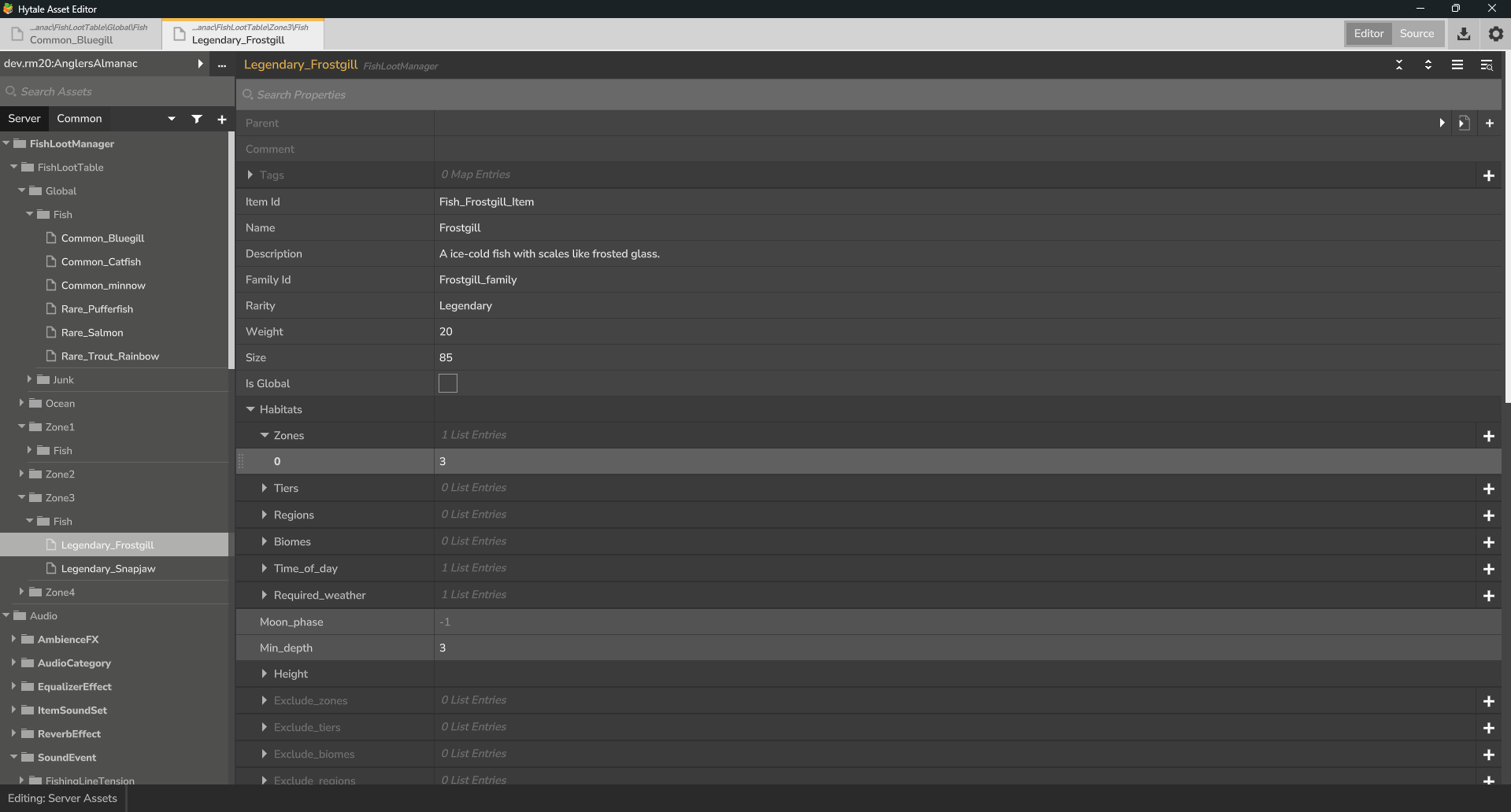 ItemId: Internal string ID for the item.FamilyId: Groups fish for specific mechanics or Almanac sorting.Weight: The base probability value (rolled against the total pool).IsGlobal: Iftrue, the fish ignores Zone/Region/Biome requirements (but still respects environment checks like depth and height).